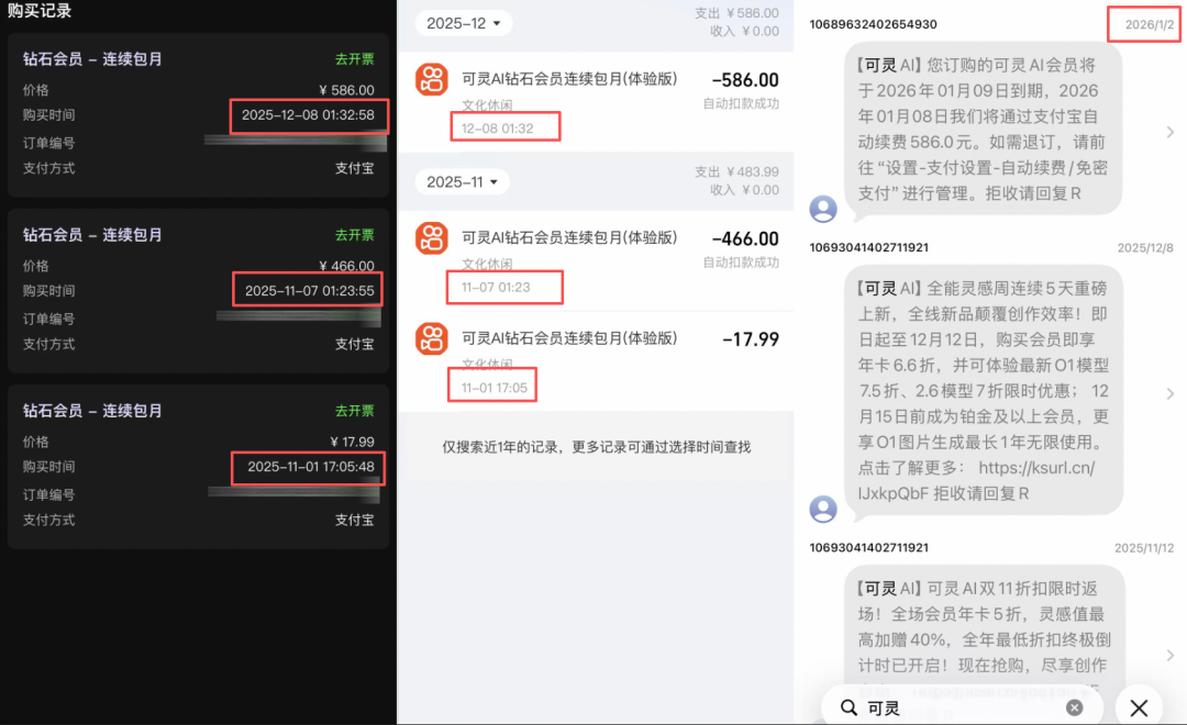 就续费提醒一事,米萌默示:“诚然收到了站内信的指示,但因为并未盘算推算连续用可灵AI这个干事,未点开网页或APP放哨;短信指示是第3次自动续费前才收到,第1、2次自动续费时都充公到。”