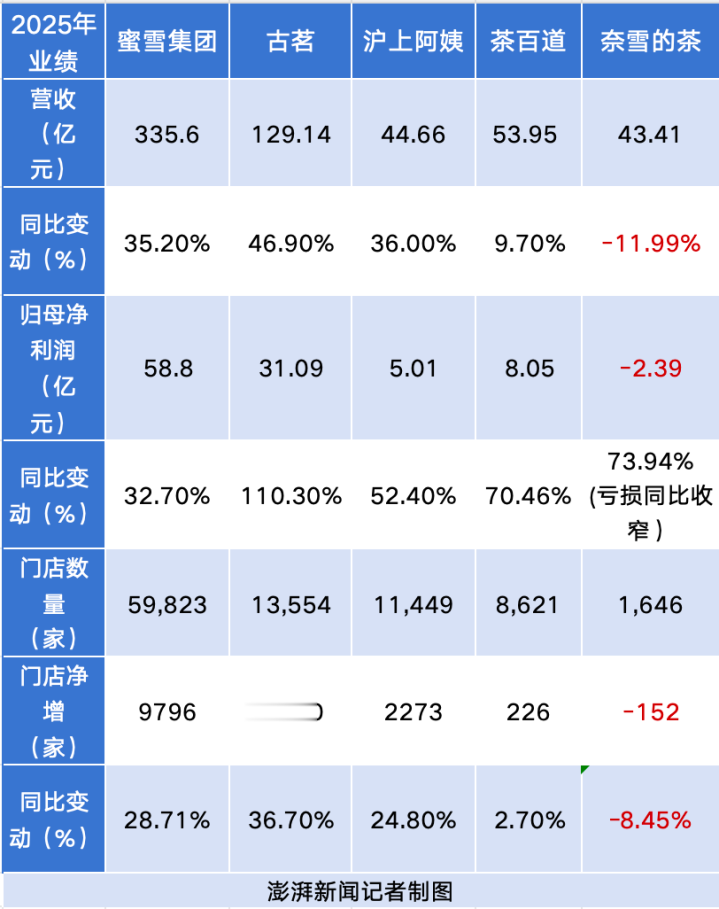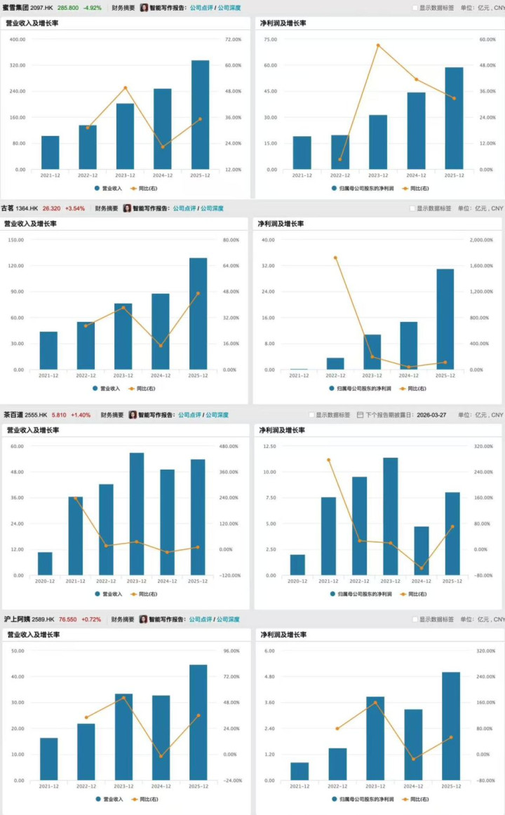 收尾3月27日,蜜雪集团(2097.HK)、古茗(1364.HK)、茶百谈(2555.HK)、沪上大姨(2589.HK)以及奈雪的茶(2150.HK),五家新茶饮港股上市公司陆续清晰完2025年年度事迹。