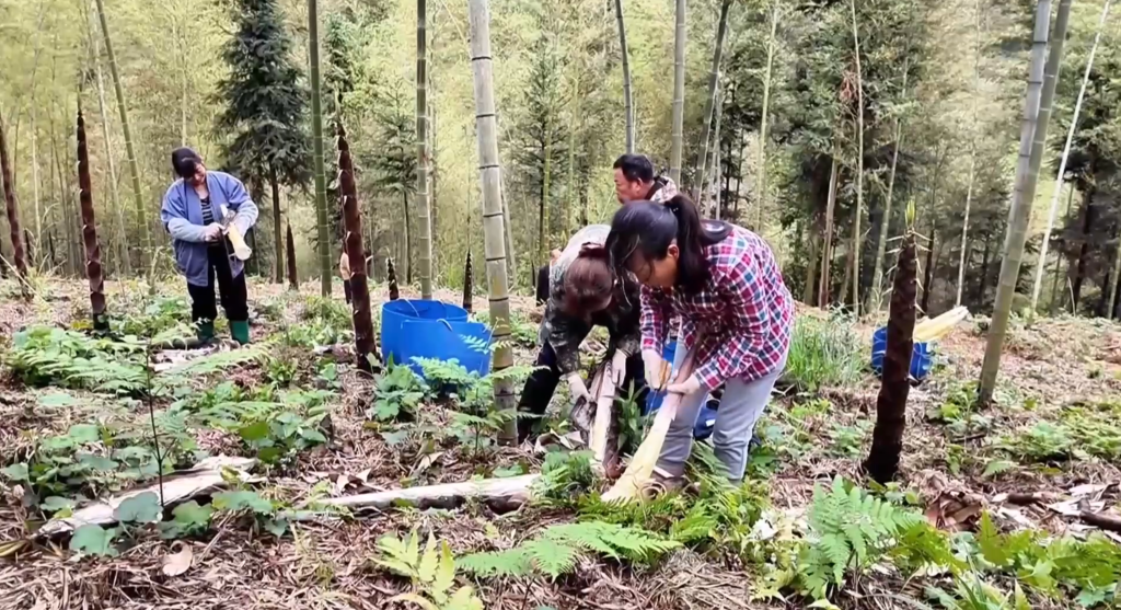 脚下刚巧春笋采挖季节,在湖南省桃江县鸬鹚渡镇长江村,300亩的笋竹两用林基地内,村民们正在采挖崭新的春笋。