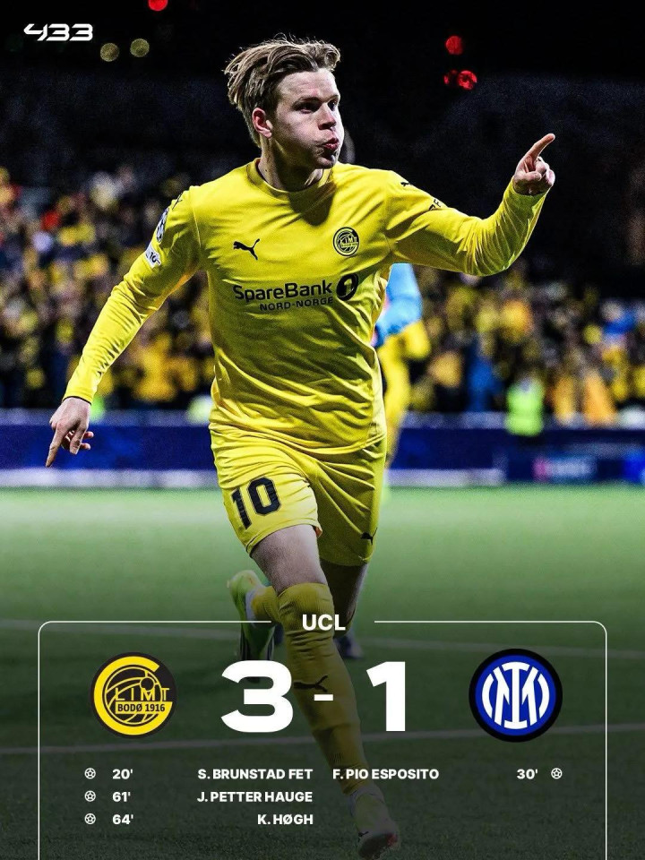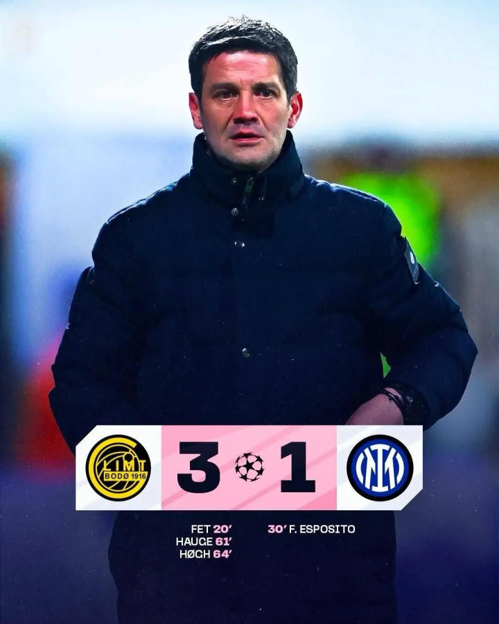 首回合的失利并非或然。博德醒目主帅克努森打造的4-3-3体系,交融了荷兰全攻全守与挪威原土反击秉性,在零下8度的极寒中阐扬得长篇大论。丹麦中锋卡斯帕·霍格成为国米防地的恶梦,他一东谈主独造三球,延续了麇集四场欧冠进球的恐怖现象。