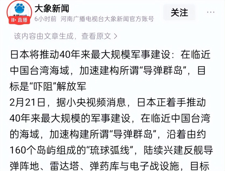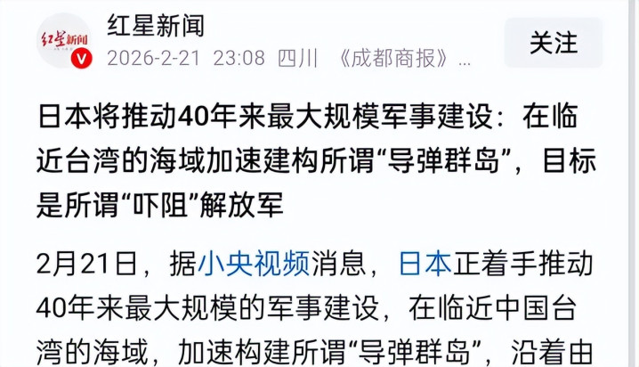 据《小央视频》2月21日的视频报说念,日本正紧锣密饱读地推动一项堪称40年来最大鸿沟的军事配置,野心是在相近中国台湾的海域,沿着由约160个岛屿组成的“琉球曲线”,把琉球群岛打形成所谓的“导弹群岛”。