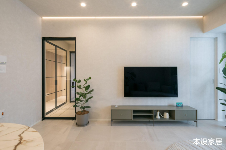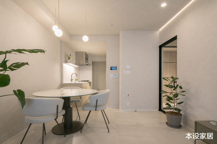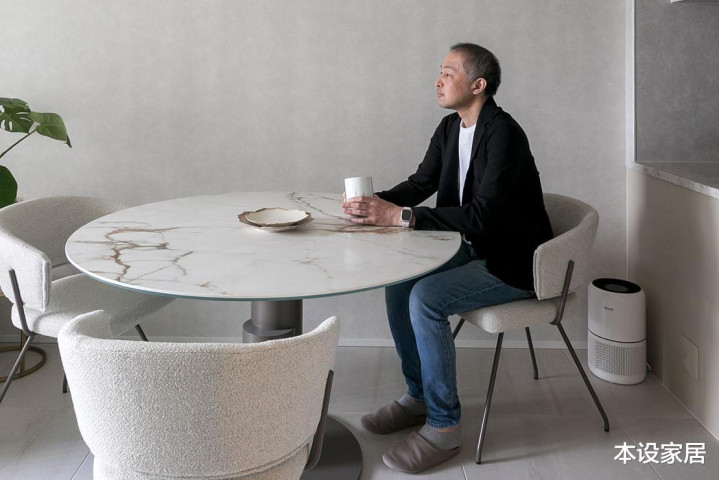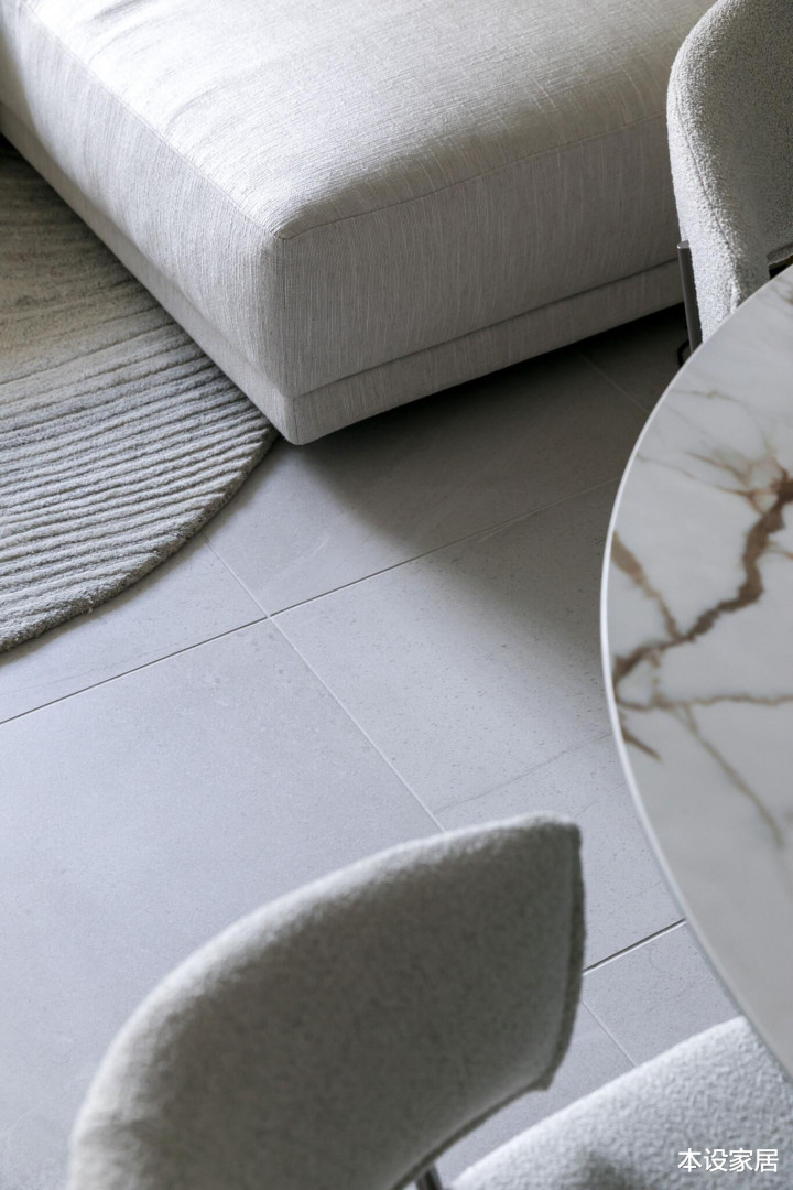 客餐厅的瓷砖、沙发、地毯、餐桌椅和墙面皆采用同色系材质,营造出的浅灰色彩,自带静谧感。