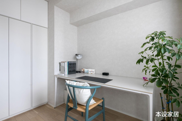 书斋从客厅干涉,白色的储物柜和书桌,搭配浅灰色墙面,真让东谈主欣慰。窗外不错看湖看水,更辽远便是高楼林立的高贵,闹中取静,完整。