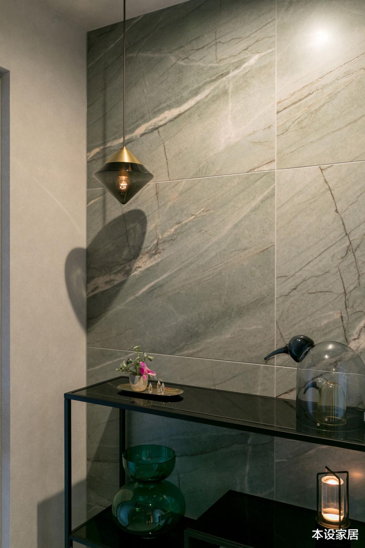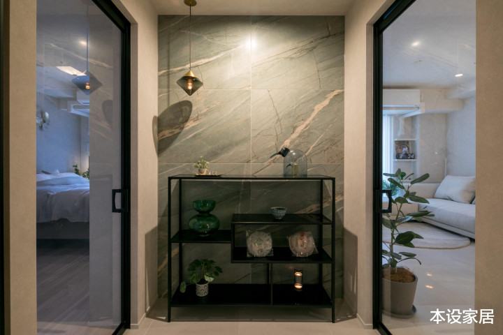通过玄关,是朝南的卧室和客餐厨,中间部分的墙面贴橄榄绿大理石,与极简的展示架和饰品搭配的诟谇分明。