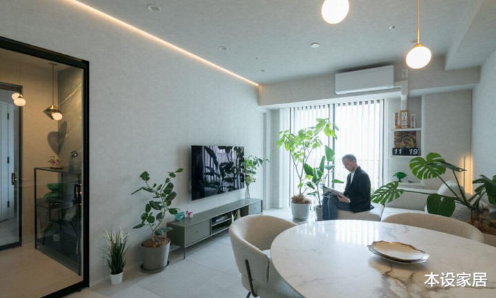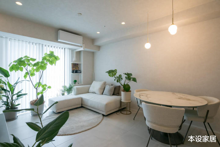 L型的布艺小沙发靠窗摆放,莫得茶几,莫得电视墙,搭配黄金榕、龟背竹、天国鸟和鸭掌木等绿植,在点式和条式暖光灯的衬托下,空间显得愈加温馨、干净和通透,越过舒坦。