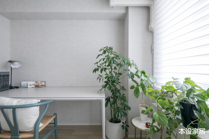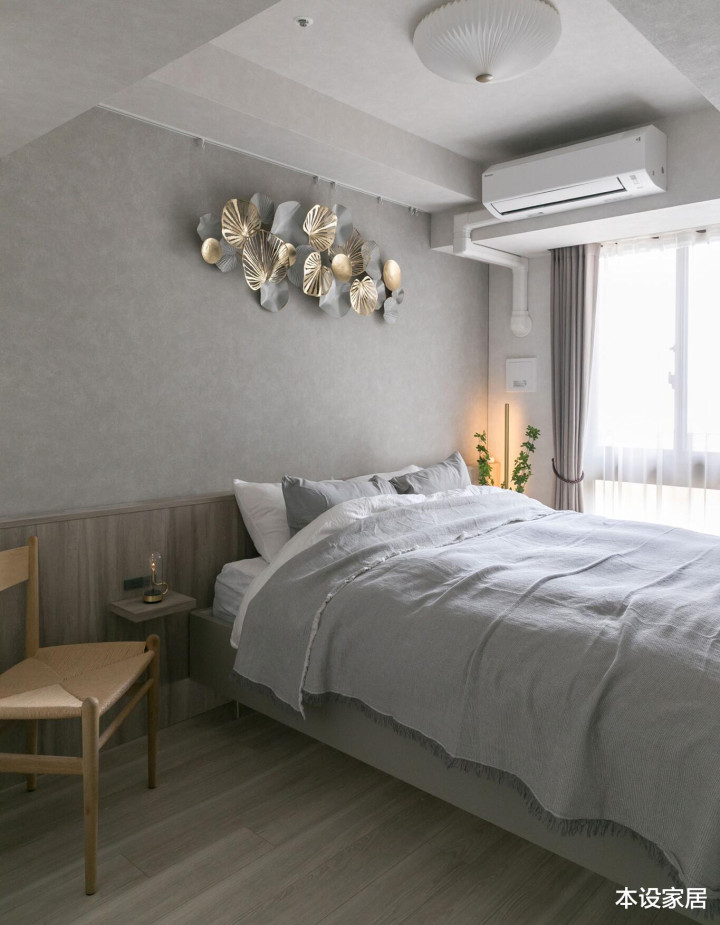 田中将1.5米宽的悬浮式床靠窗摆放,搭配灰白色组合的棉麻床品,干净整洁又舒坦,而背墙的植物造型遮挡品,看起来风雅高等,每天迎着第一缕阳光中醒来,生涯也变得无失色好。