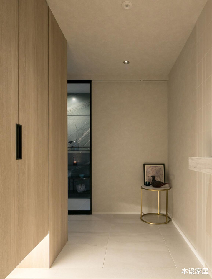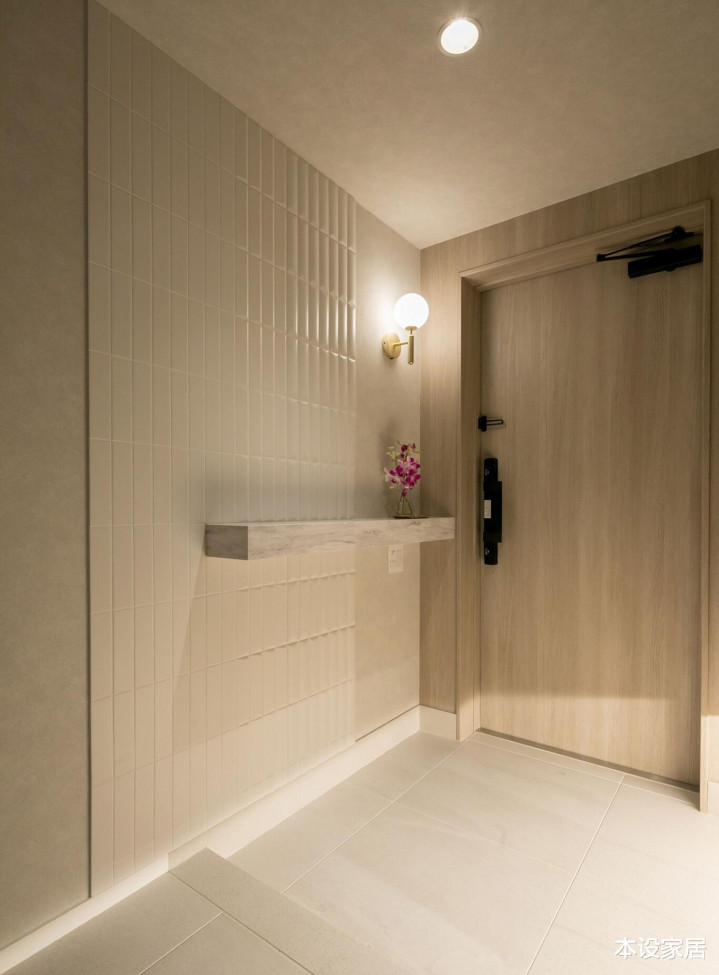 左边作念了一组到顶的储物柜,把外穿过的衣物、包包和鞋靴有序地纳入其中,入户门右边的台子放钥匙等小件物品,转角处饰品的点缀,这个空间就十分完整了。