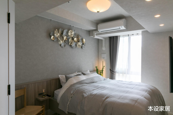 卧室延续了举座的轻简感,面积不大,即使拉上纱帘一经敞亮。