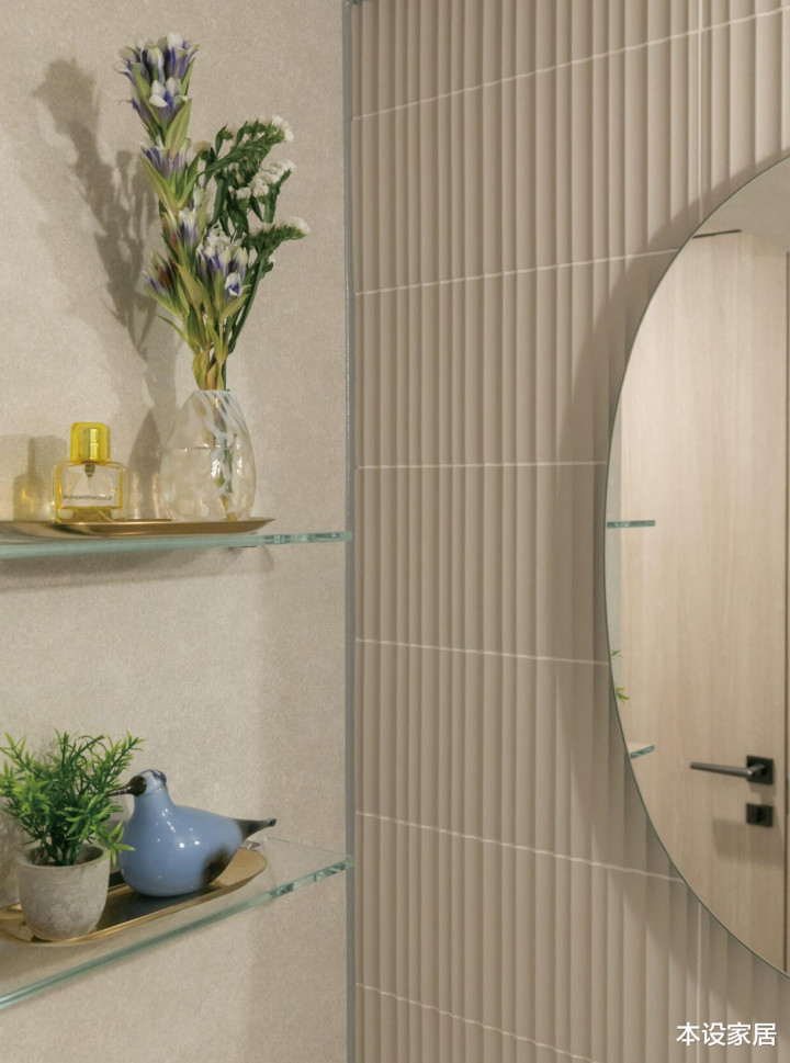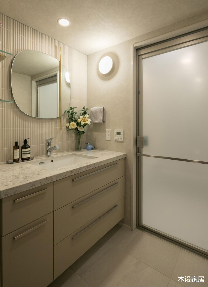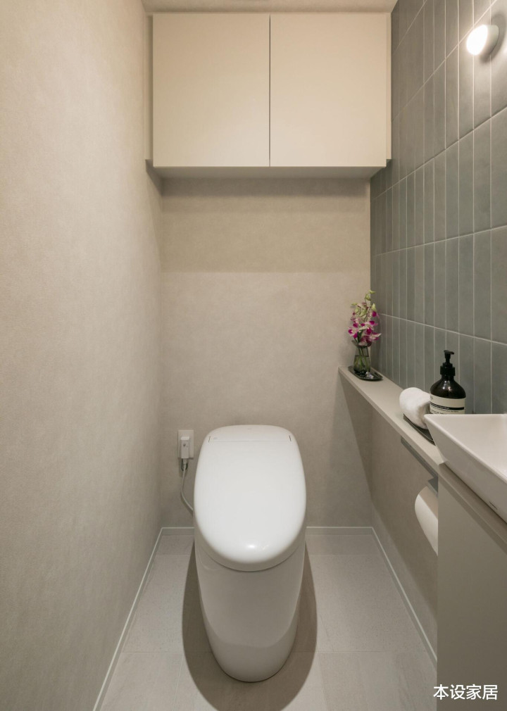 举座以浅灰色为主调,洗手台和马桶间皆有收纳柜,干净的看不到一丝水渍,再辅以鲜花点缀,即使踏进于密闭的小空间中,也不会显得逼仄拥堵,反而带来一份安全感。
