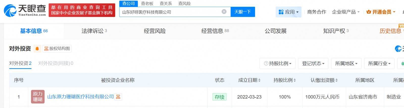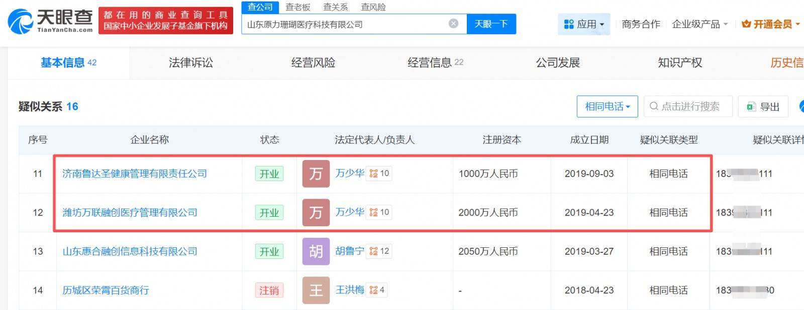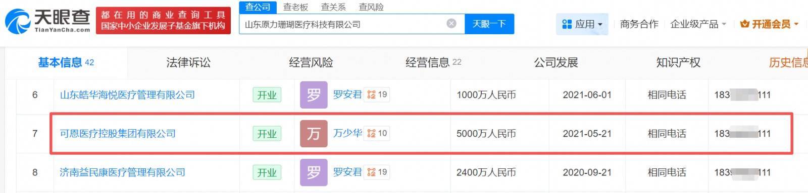 记者注重到,据天眼查表现,好呀医疗全资控股的山东原力珊瑚医疗科技有限公司(下称“原力医疗”),其企业筹谋电话与可恩口腔实控东说念主万少华旗下多家公司齐备一致,波及可恩医疗控股集团有限公司、济南鲁达圣健康措置有限株连公司、潍坊万联融创医疗措置有限公司、可恩口腔旗下济南可恩清田成长医疗投资措置合资企业(有限合资)四家由万少华担任法定代表东说念主或实质限制的企业。