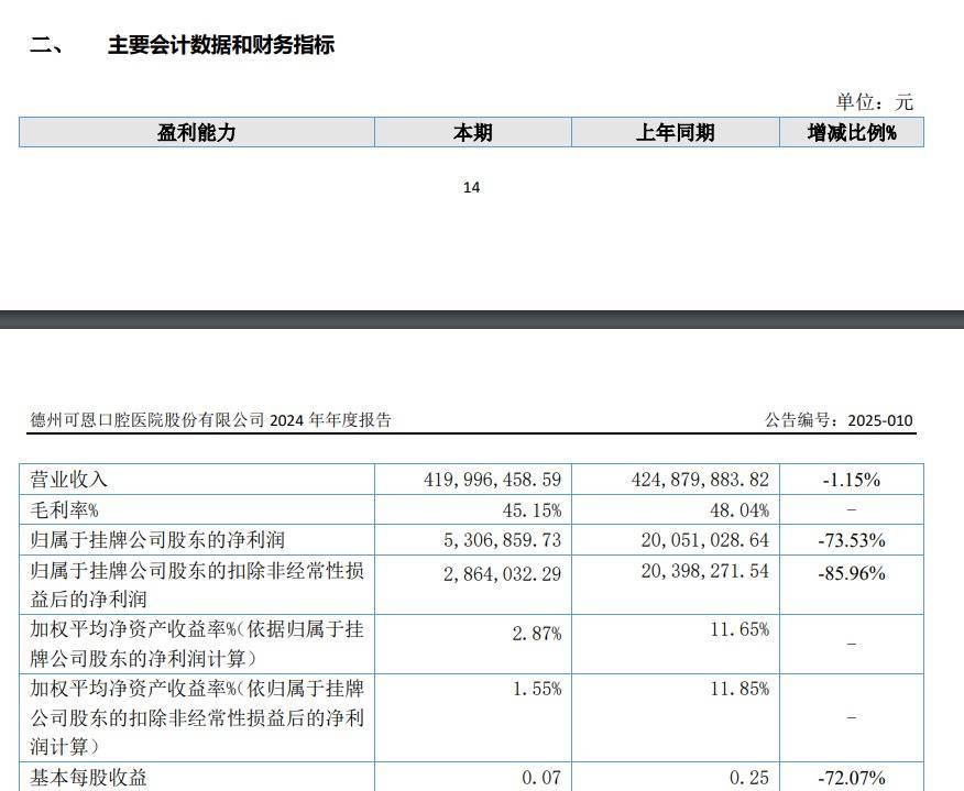 回溯可恩口腔最新线路的事迹情况,其2024年年度陈说表现,陈说期内公司兑现买卖收入4.20亿元,同比着落1.15%;包摄于挂牌公司鞭策的净利润0.05亿元,同比着落73.53%。业务板块方面,口内牙周技俩营收0.42亿元,同比增长1.81%,毛利率41.11%;开拓技俩营收0.91亿元,同比着落18.94%,毛利率45.21%;口外扶助技俩营收1.64亿元,同比增长16.77%,毛利率50.88%;儿牙正畸技俩营收0.87亿元,同比着落8.54%,毛利率39.39%。