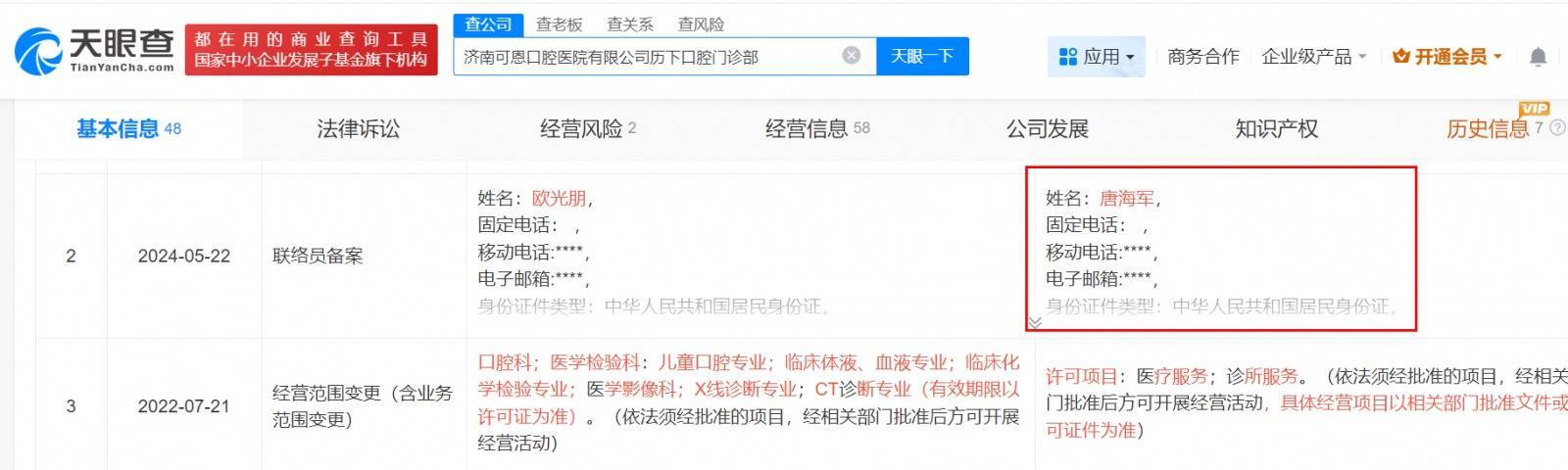 此外,原力医疗的筹谋电话还与可恩口腔控股60%的山东恩民企业措置有限公司一致,该公司财务持重东说念主相似为郭艳红。原力医疗的邮箱信息还与济南承恩医疗科技有限公司、山东镭恩医疗科技有限公司、聊城伊姿娇好意思医疗科技有限公司三家企业重合,而这三家企业的法定代表东说念主唐舟师,同期担任可恩口腔多家门诊部的连络员,系公司职工。