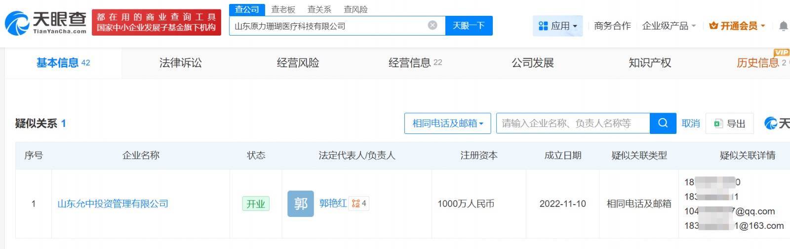 然而,除了筹谋电话高度吻合外,邮箱信息的重合更突显关联疑窦。原力医疗2023年的筹谋邮箱,与可恩口腔旗下济南可恩清田成长医疗投资措置合资企业(有限合资)、济南可恩口腔病院有限公司历城分公司、济南明湖可恩口腔病院有限公司的邮箱齐备一致。2024年原力医疗变更后的筹谋邮箱,又与山东允中投资措置有限公司蚁合两年的筹谋邮箱保捏一致。