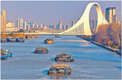 京杭大运河江苏淮安段,满载物质的船舶有序飞翔。