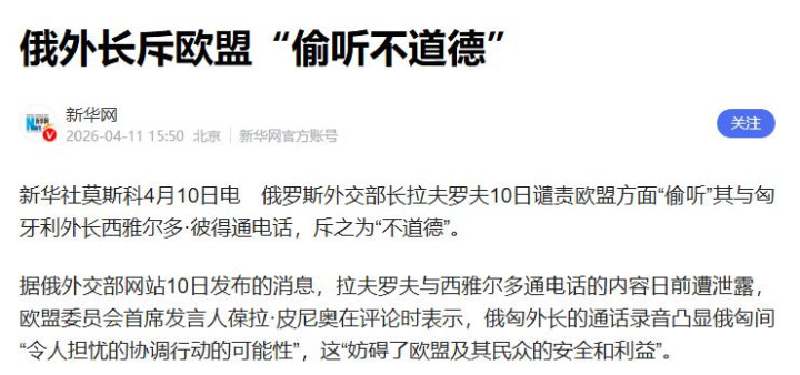 就在欧盟忙着质问匈牙利的时候,俄罗斯外长拉夫罗夫,径直把锋芒瞄准了欧盟,一番话怼得欧盟哑口尴尬,拉夫罗夫公开责骂欧盟,说他们偷听我方和西雅尔多的通话,是极其不说念德的步履。