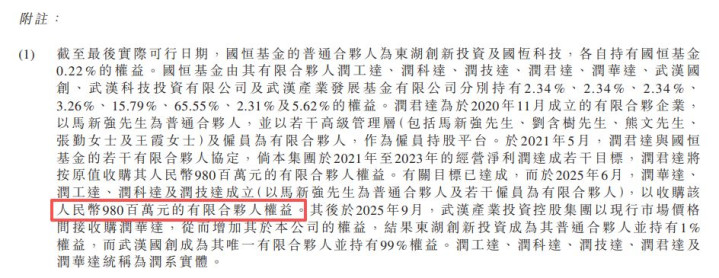 招股书表露,2021年5月,润君达与国恒基金的些许有限结伙东说念主达成协定,端正要是华工科技在2021年至2023年时刻的谋划净利润达成特定标的,润君达将按原值收购其9.8亿元的有限结伙东说念主权益。关联功绩标的达成后,马新强及些许职工于2025年6月成立了新的润系实体,收购了该笔9.8亿元的有限结伙东说念主权益。