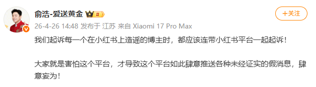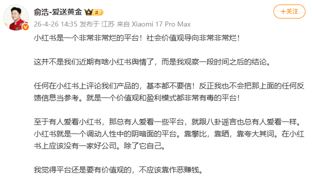 4月26日,追觅科技首创东说念主兼CEO俞浩本日在酬酢媒体发文,对小红书平台抒发了品评。