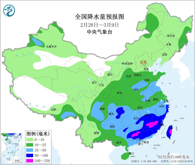 翌日10天(2月28日-3月9日),华北南部、黄淮、江淮、江汉、江南、华南、西南地区东部及西藏东南部等地累计降水量有10~30毫米,其中江南南部、华南、贵州东北部等地有50~80毫米,局地100~130毫米;新疆北部、西北地区东部、华北北部、东北地区及内蒙古中东部等地降水量有3~8毫米,新疆伊犁河谷局地超过20毫米;上述大部地区降水量较终年同时偏多5成~1倍,局地偏多2倍以上。