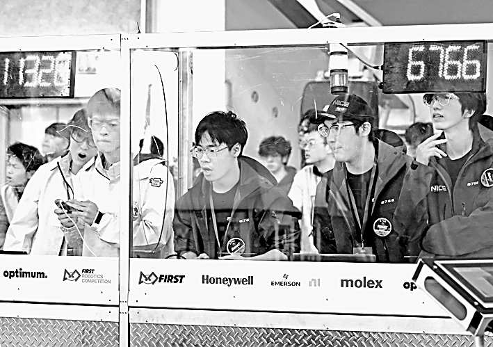 2026FIRST机器东说念主竞赛(FRC)上海国外区域赛在华东师范大学闵行校区举行,图为参赛选手在比赛中操控机器东说念主。新华社发